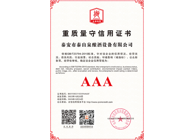 泰安市泰山泉釀酒設備有限公司,是一家專業從事釀酒設備機械化研發并集技術咨詢,工程設計,制造安裝,人員培訓及售后服務為一體的綜合性企業,本公司主要產品為:大曲清香、小曲清香、大曲醬香、大曲濃香等香型白酒機械化設備。 本公司與中國科學院自動化研究所簽訂技術服務合同,引進先進技術,研究生產全自動化機械釀酒設備,由中國科學自動化研究所的技術支持,打造最先進的生產釀酒設備,公司有信心打造全國最先進白酒...
